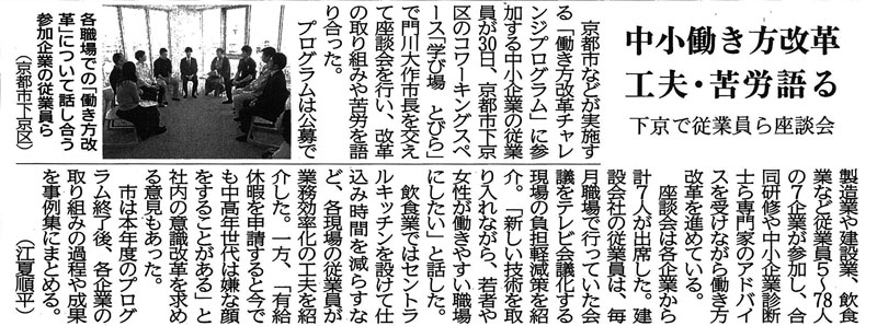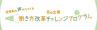 働き方改革チャレンジプログラム…京都市及び(公財)京都高度技術研究所では、中小企業が主体的に働き方改革に取り組むノウハウを提供するため、働き方改革に挑戦する企業を支援し、働き方改革のモデルを創出します。(ソーシャルイノベーションラボラトリー京都ウェブサイトより抜粋)