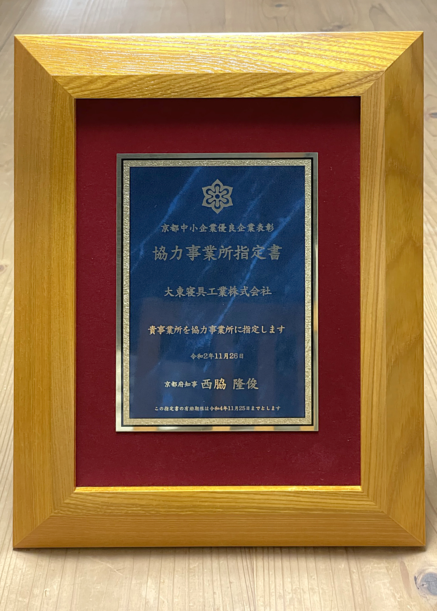 大東寝具工業株式会社(本社:京都市伏見区 代表取締役:大東利幸)は、2020年11月26日優位性に富んだ卓越した技術と京都らしさを備えたものづくりが認められ、京都産業の振興に貢献したとして、令和2年度の京都中小企業優良企業表彰「ものづくり部門」を受け、京都府の協力事業所に指定されました。