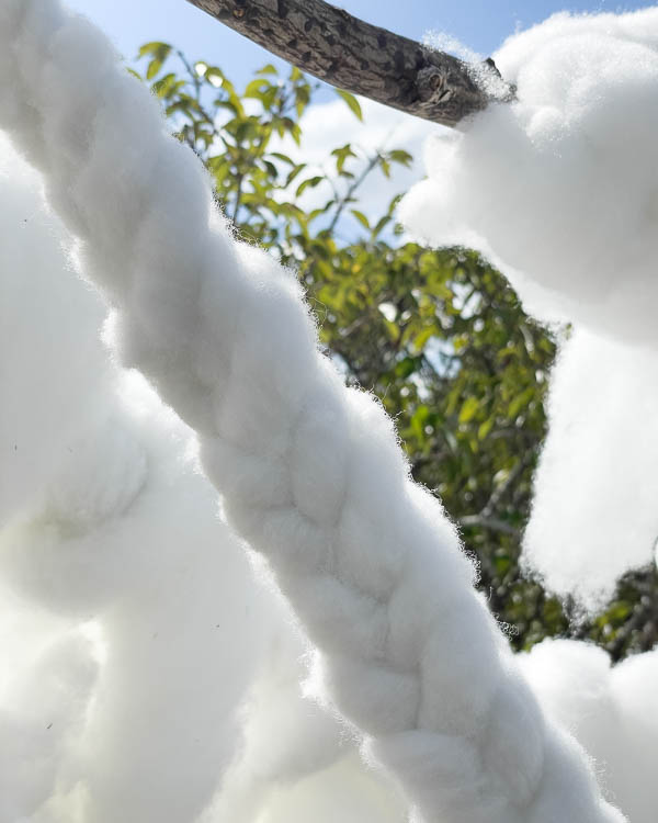 第5班は、仁和寺境内の御室八十八か所で採れた倒木とポリエステル綿を組み合わせた建築「わ」は、綿という一見、建築の構造に使えない柔らかな素材を、束にして撚り合わせることにより、倒木を支え、繋げる役割として利用されており、不思議な形態を持つ建築となりました。建築解体後の綿の一部は当社が回収し、ゴミなどを取り除いた上で「製品への再利用」または「製品の試作品」として利用する予定です。