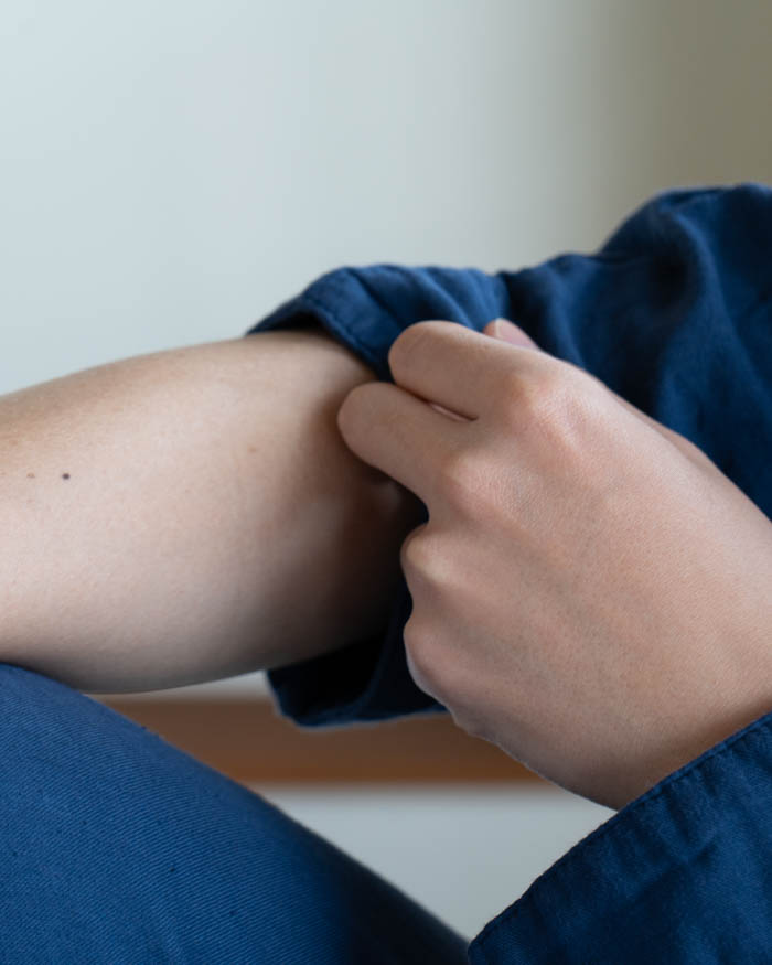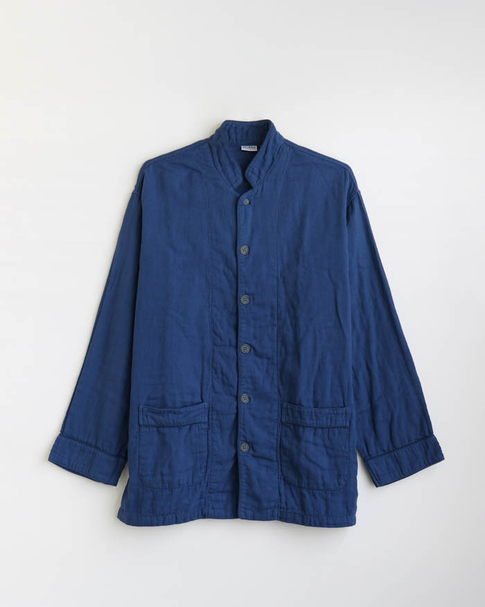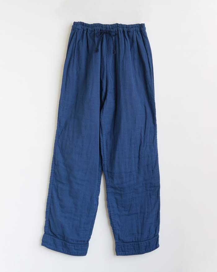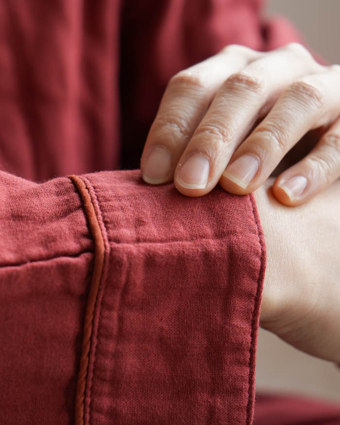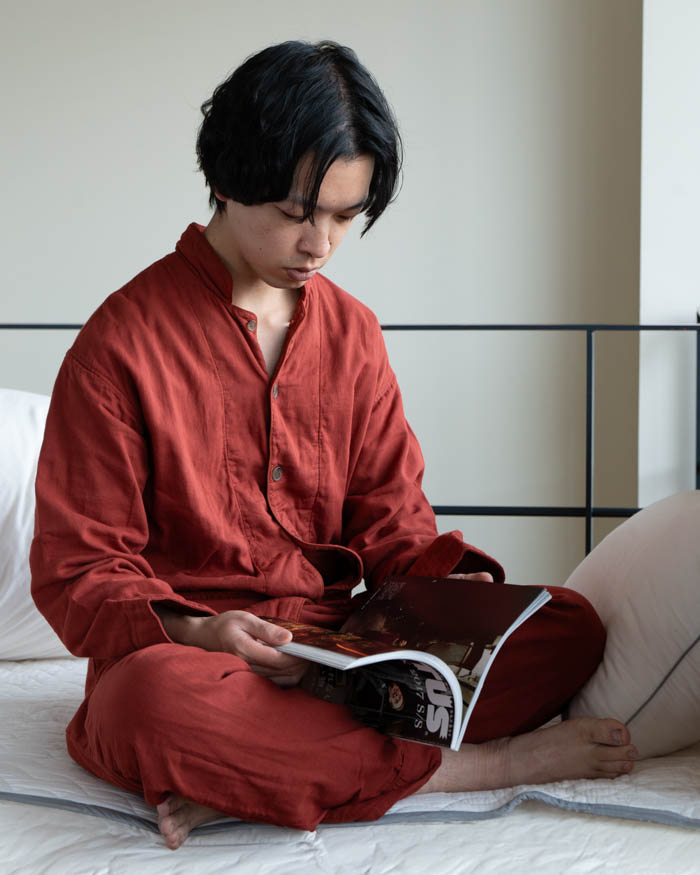 京和晒綿紗ガーゼパジャマれんが・こんは、他のシリーズとは異なる「製品染め」でつくりました。製品染めの水洗い工程で縫製のために施された糊が落ちますので、洗濯後のパジャマと同じようにふんわりとした仕上がりになっております。