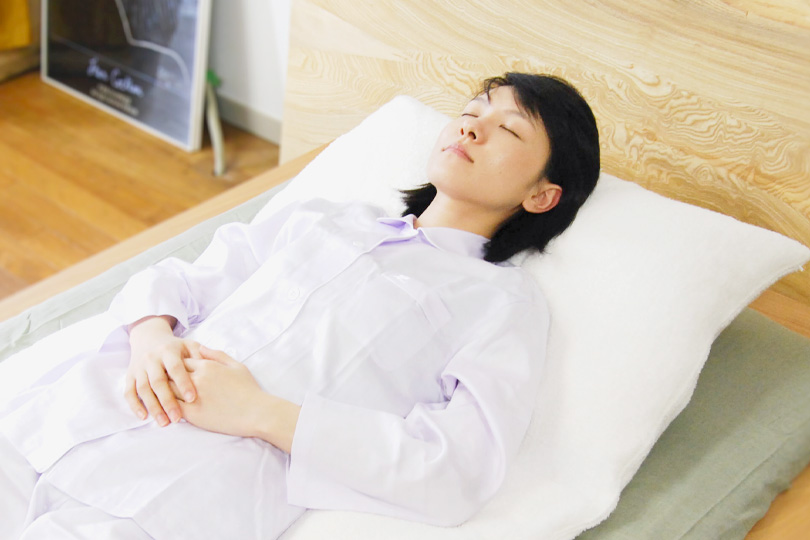 いびきをかきにくい横向きの姿勢で眠れるよう、睡眠クリニックでの終夜ポリグラフィ検査などを実施し、横臥寝の有効性の確認、姿勢の継続維持、性能や快適性を検証。