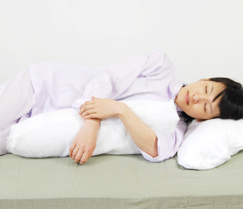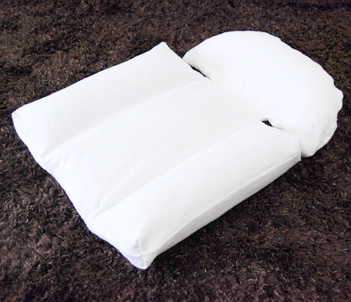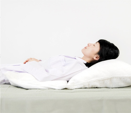 背中をしっかり支える立体加工を施し、頭部を楽な姿勢に安定させるための抱き枕となるサイド・ウォール、気道を確保するため、頭部の高さと下あごの角度を調整しやすい枕と、朝まで横臥寝姿勢を保つための工夫が散りばめられています。